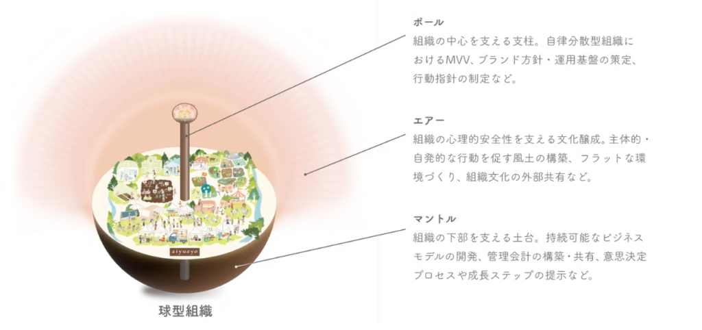 そんな問いから、aiyueyoの組織作りはスタートしました。らしさよりも一体感。一律な管理が前提となった組織運営。この当たり前を疑い、畑の健やかさを応用した組織を1から作ってまいりました。そうして行き着いたのがポール・マントル・エアーの3要素によって球体型に成立させる自律・分散組織モデルaiyueyoです。