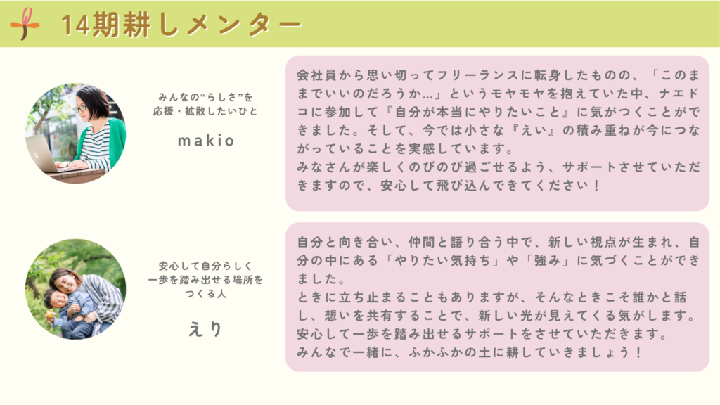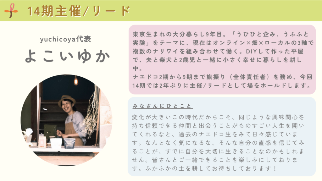 ここまでお読みいただき「ぜひ14期のナエドコに参加したい!」と感じた方は、エントリーフォームからお申し込みください。