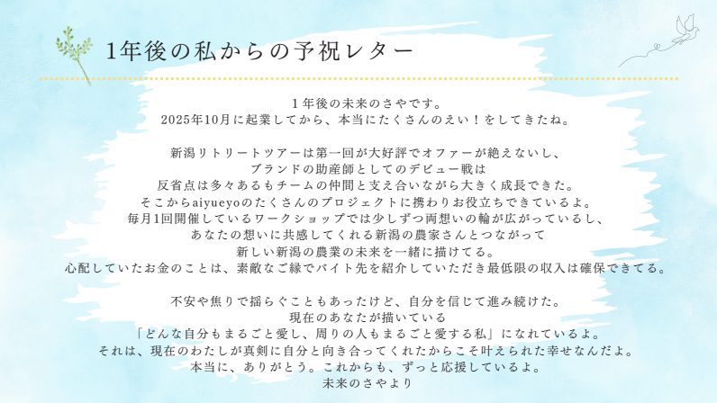 その度に、ナエドコで学んだ「我が身整え期」のお話を思い出します。我が身整え期は「理想に向かう過程の、自分自身の準備期間」という考え方。今の私はまさにそのフェーズであり、「ただ目の前のことにガムシャラに向かっていけばいい」という講義中の言葉から、このまま進んでいってもいいんだと、すごく背中を押してもらいました。