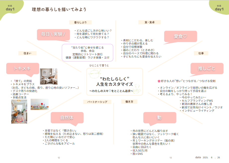 また、やりたいことで収入を得る道がまだ見えていない私にとって、自分の活動を「仕込む」「叶える」「稼ぐ」に分けて考えるという学びは、お金に対する焦りを手放すきっかけとなりました。