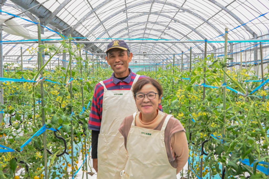 赤いトマトも黄色いトマトも、後味は軽やかで、気づけばもうひとつ食べたくなる味わいです。その美味しさから、収穫の時期には予約分で完売することもあるとのこと。このトマトを育てているのが、宮島農園の真一(しんいち)さんとあゆみさんです。