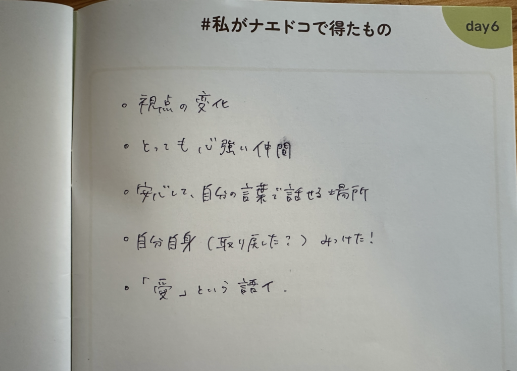 また、人からの言葉で視界が開けるようなこともあり、「誰かと一緒に、自分に向き合いたい」と思っていたわたしは、ナエドコに参加してよかったと改めて感じました。