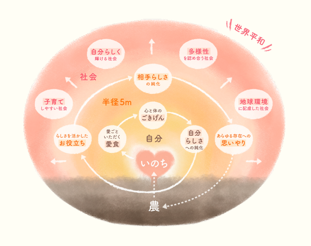 「いのち」を中心に広がる愛本主義の図を見て、心がじんわりあたたかくなり、こうなりたいと初見にも関わらず感じたことを覚えています。