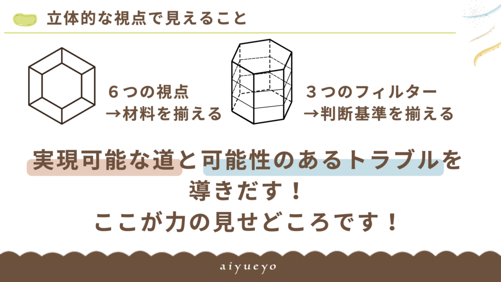 前段で集めた判断材料をもとに、次は判断の軸を整理していくのだそう。具体的には「費用・時間・整合性」のフィルターを通して、何を優先し判断するのか、整理、提案することを教えてくれました。