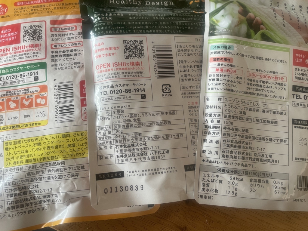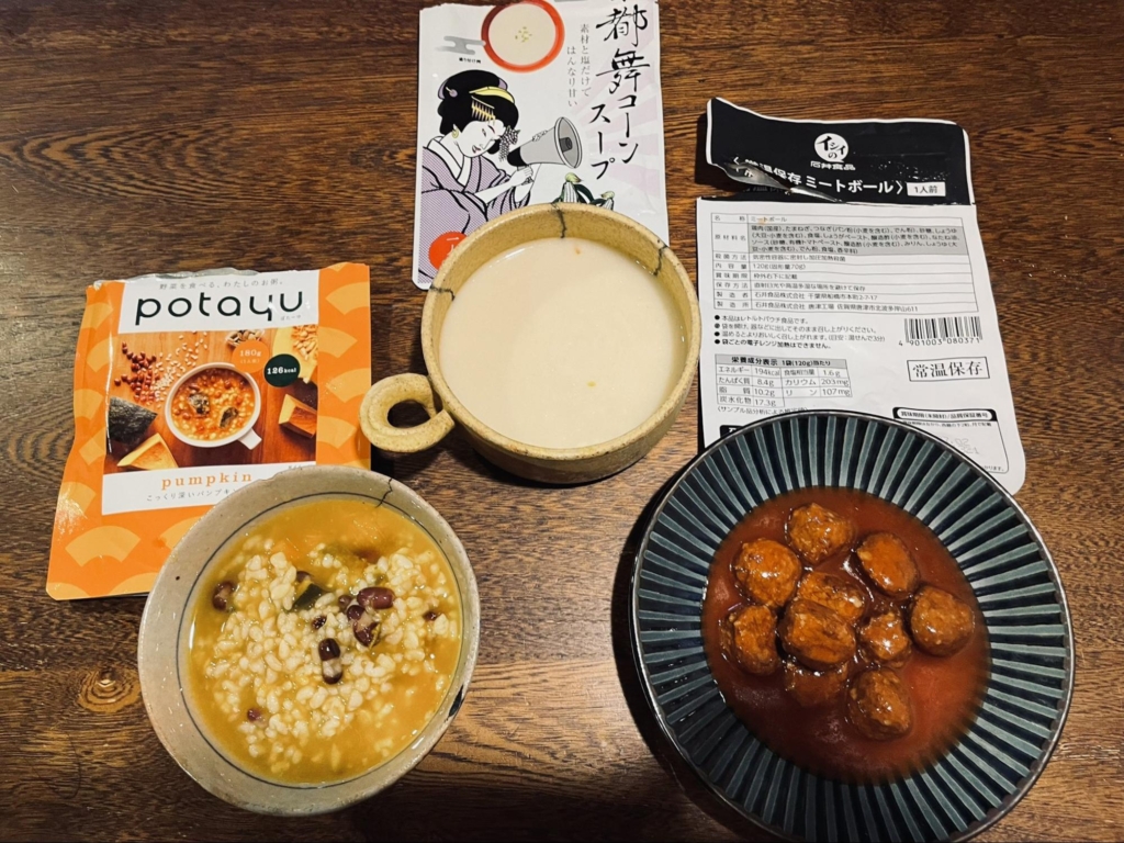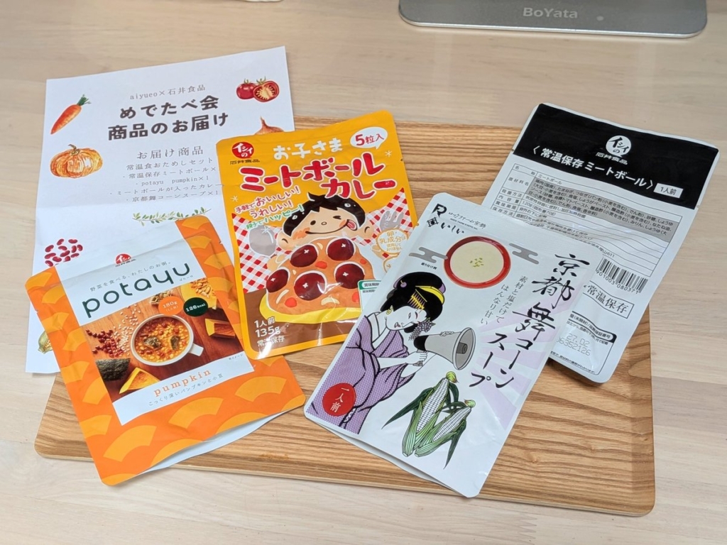 今回の非常食・常温食めでたべ会のラインナップはこの4点。