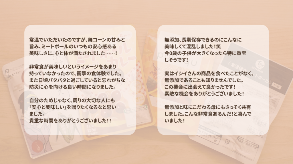 今回のめでたべ会をきっかけに、日々の食卓と防災ボックスが、より愛にあふれたものになりました!