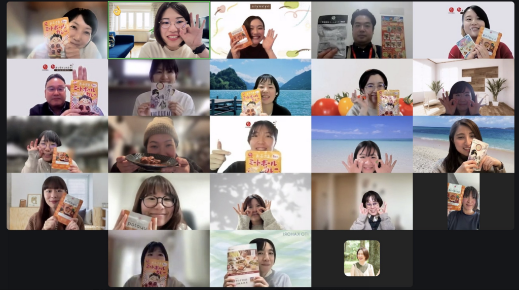 開始から約20分、それぞれが温めたり、お皿に盛り付けたりと準備が整ったところで、一斉にいただきます!集合写真を撮って、オンライン越しにみんなで食卓を囲む時間のはじまりです。